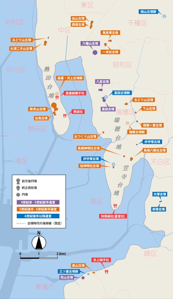 (4)5世紀代に瑞穂台地に高田古墳、八幡山古墳、八高古墳などを築造した愛智郡の氏族グループは、熱田台地に勢力を拡大したグループと結びつき尾張氏という擬制的同族組織の中に組み込まれていったと想定することも可能である。