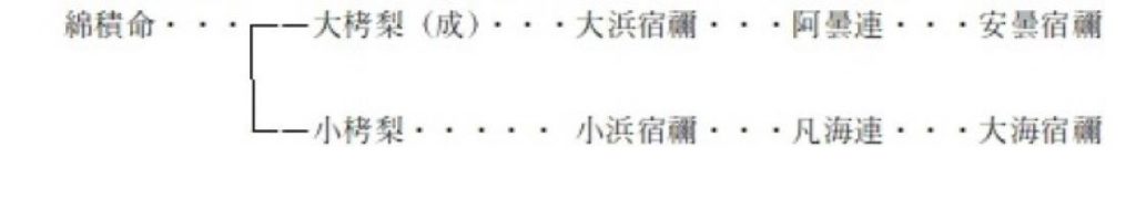 阿曇氏の系譜については確かなものはありませんが、『新撰姓氏録』や『高橋氏文』の逸文などを参考にして、阿曇氏と同祖一族の凡海(大海)氏を含めた想定系譜の概略はつぎのとおりです。