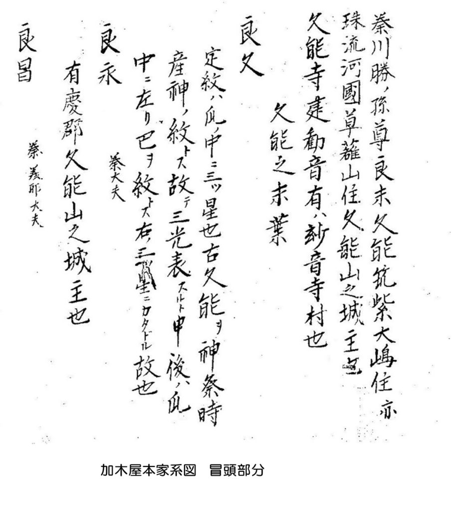 所蔵されている元庄屋家の久野様から見せていただく機会がありましたが、本家系図は34代宗政まで系線が書き込まれていない系図の為、ここでは系図そのものの掲載は冒頭部分のみとし、分家系図を参照しつつ、分家系図に書かれていることを織り交ぜながら話を進めます。