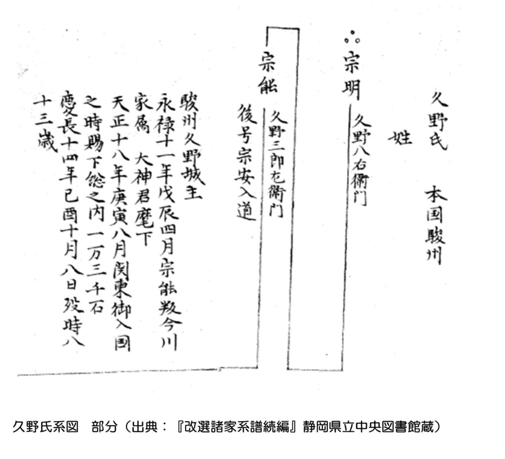 さらに、静岡県立中央図書館に所蔵の松下重長の編になる『改選諸家系譜続編』の八右衛門宗明から始まる久野氏系図の冒頭に「久野氏本国駿州」と書かれていることも、これまでの検討結果から誤記、誤伝の類ではないようです。