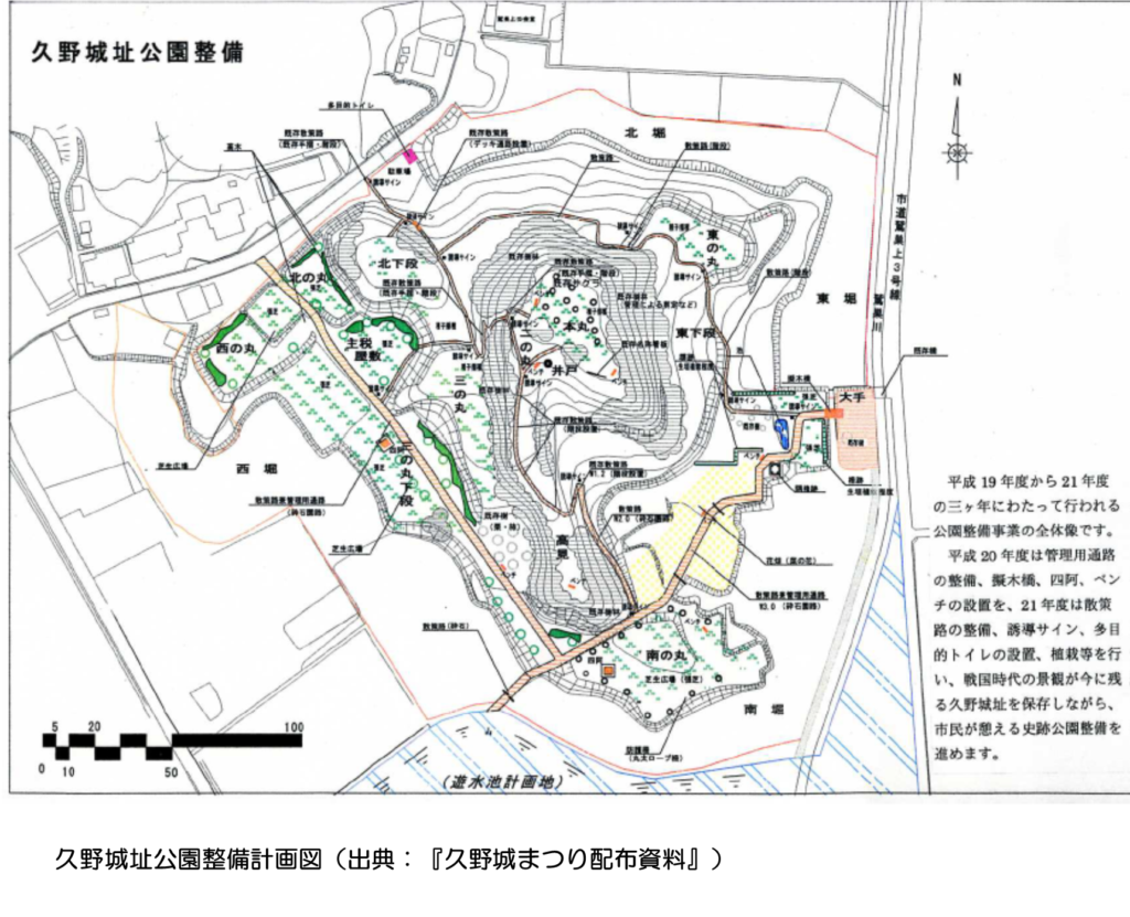平成20年11月に開催されました「久野城まつり」で配布の久野城址公園整備計画の資料がもっとも城址の様子がよく分かる図面だと思いますので掲載しておきます。