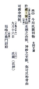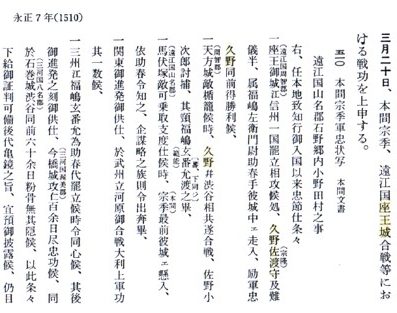 この軍忠状写の最初の項目が文亀元年(1501年)と想定される今川氏親判物に対応しているものと思われますが、蔵王城関連では藤田鶴南編『戦国史城 高天神の跡を尋ねて』の「本間八郎三郎氏清 丸尾修理亮義清の兄弟」の項で、本間家は氏季の子良清、永享12年(1440年)足利持氏に従い殉死し領地を没収された。長子辰若十一歳、逃れて駿河の今川氏に頼り長じて遠州久野城番になったとありますから、本間氏は宗季より以前の辰若の時代に久野城(蔵王城)の城番であり、本間氏の寄親であり今川氏の重臣でもあった高天神城主の福嶋(くしま)左衛門尉助春が久野宗隆以前の蔵王城主を兼ねていたものと考えられます。